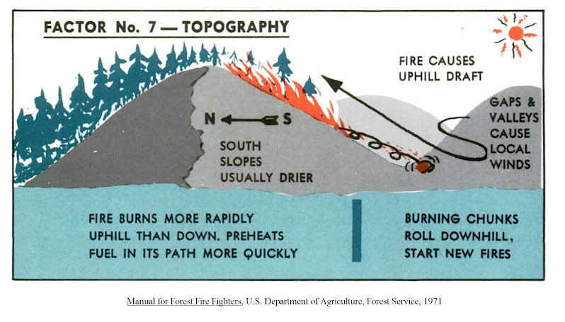 Also, if there are fires upslope from you, watch out for burning material rolling downhill or sparks and embers falling downhill and starting fires below you.