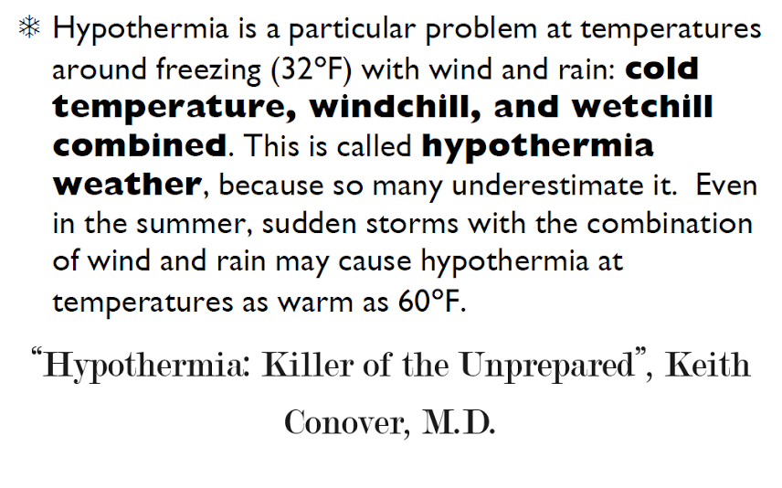 Keith, M.D.; “Hypothermia: Killer of the Unprepared”, https://sites.pitt.edu/~kconover/ftp/Hypothermia%20Basics.pdf,