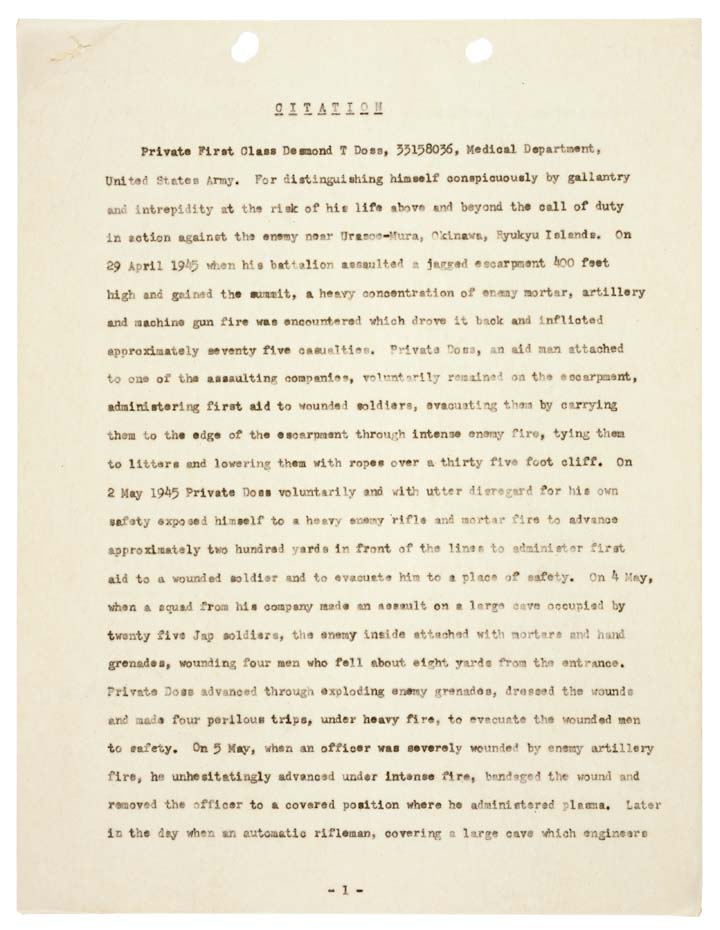 National WW2 Museum; “Private First Class Desmond Thomas Doss Medal of Honor”, October 12, 2020, https://www.nationalww2museum.org/war/articles/private-first-class-desmond-thomas-doss-medal-of-honor, accessed May 10, 2025